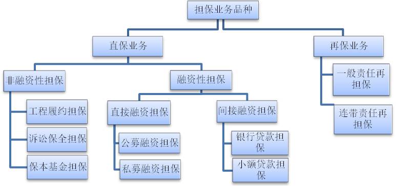中国担保市场业务由再担保业务和直保业务构成,通常再担保业务由政府审批的为数不多的政策性再担保机构承接,一般商业性担保机构仅从事直保业务。
