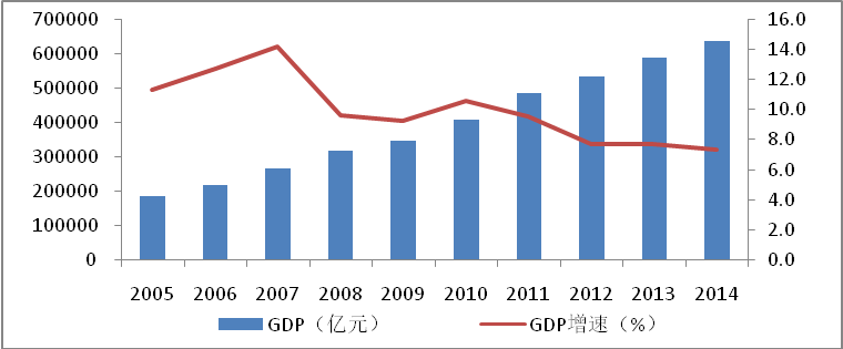自2011年以来,中国宏观经济增速呈现持续放缓的趋势。2014年,国内生产总值(GDP)为636463亿元,按可比价格计算,比上年增长7.4%,增速较2013年下降0.3个百分点,其中,工业增加值227991亿元,同比增长7.0%,增速已经是连续四年下降;固定资产投资完成额512761亿元,同比增长15.3%,增速较上年下降4个百分点,增速也已经是连续五年下降。分季度来看,中国GDP同比增速第一季度为7.4%,第二季度有所恢复,达到7.5%,但第三、四季度下行,均为7.3%。
