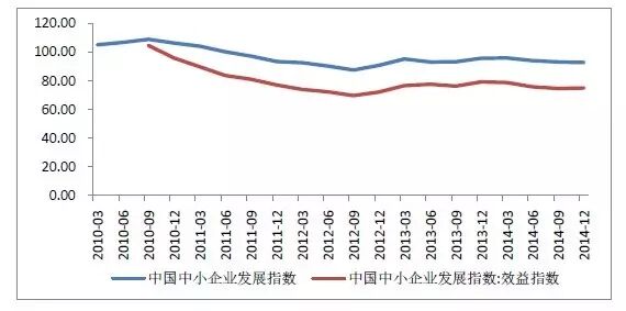 受到近年来国际市场低迷、国内经济减速下行、劳动力及原材料等要素成本持续上涨、融资难及融资贵等多方面因素叠加影响,当前中国中小企业经营十分困难。自2010年第三季度以来,中国中小企业发展指数(SMEDI)由108.9一度下滑至2012年第三季度的87.5,中小企业景气度指数连续24个月下滑。2012-2013年,中国中小企业发展指数随略有回升,但仍处于100以内的不景气区间内,生产经营情况未出现明显改善。2014年,中国中小企业发展指数逐月下降,增速明显放缓。整体来看,中小企业发展情况不容乐观。