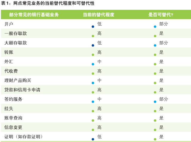 毫无疑问,网点未来承载的基础金融服务和交易功能将越来越少,而必须在网点才能完成的业务更是微乎其微。我们分析了过去10年由于监管政策、银行信息化和流程改造、电子渠道发展以及业务创新对网点基础服务和交易功能的影响,网点承载的功能的不可替代性由过去的接近100%,到目前不足20%。过去主要制约业务无法脱离网点的主要因素是监管,而最近几年,监管机构对业务电子化的态度更多的是在风险可控的前提下鼓励银行进行尝试和创新,新技术的发展(如电子签名、身份认定、信息加密、电子交易安全)使得过去很多无法实现的想法成为了可能。