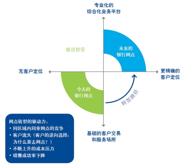 因此,未来的银行网点的制胜之道是需要对客户进行更精准的定位,同时将网点打造成专业的综合化业务平台。