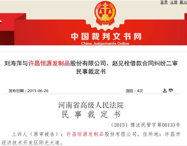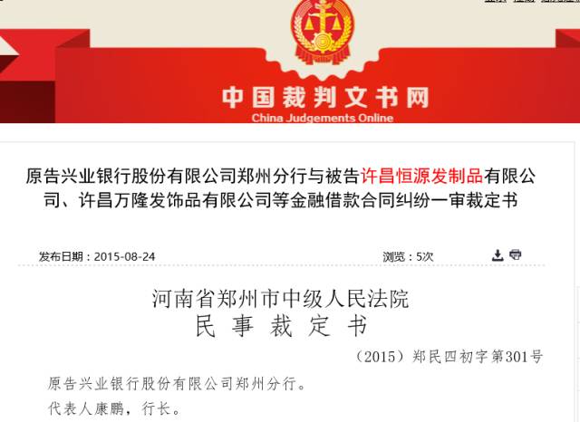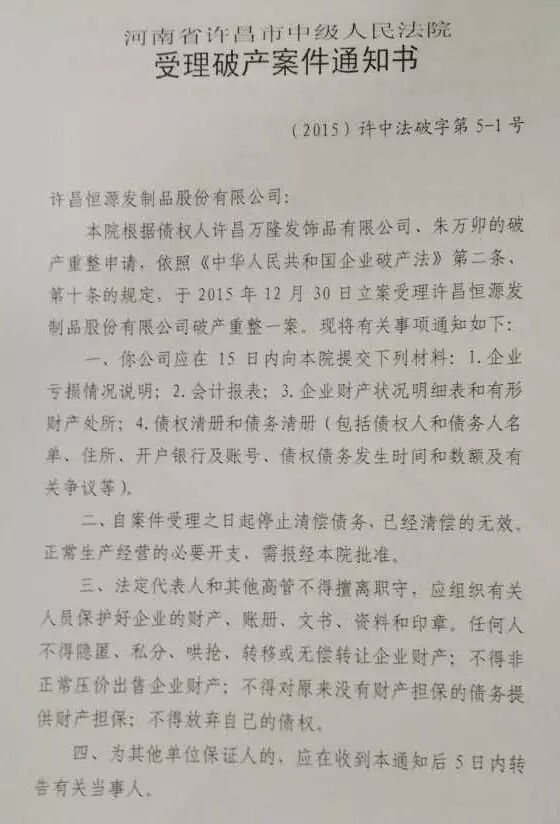 在2015年12月30日,许昌恒源发制品有限公司连接了三份许昌市中级人民法院下发的法律文书,破产重组,已经箭在弦上,很难想象实际控制人赵见栓,在面临2016年的太阳时的心情,是终于释然,还是……