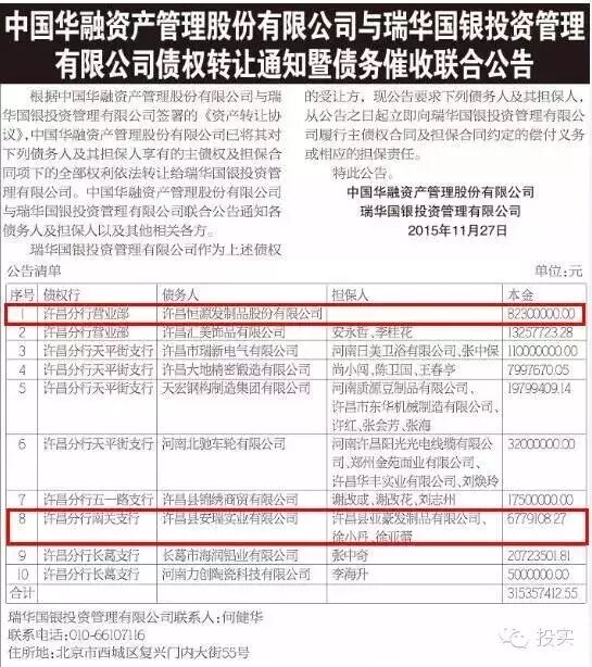 2015年11月27日,中国华融资产管理股份有限公司与瑞华国银投资管理有限公司在河南当地媒体上刊登债权债权转让通知暨债务催收联合公告。