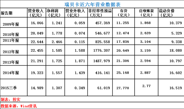 投实君从瑞贝卡的财务报告里截取了2009~2015年前三季度的几个关键数据: