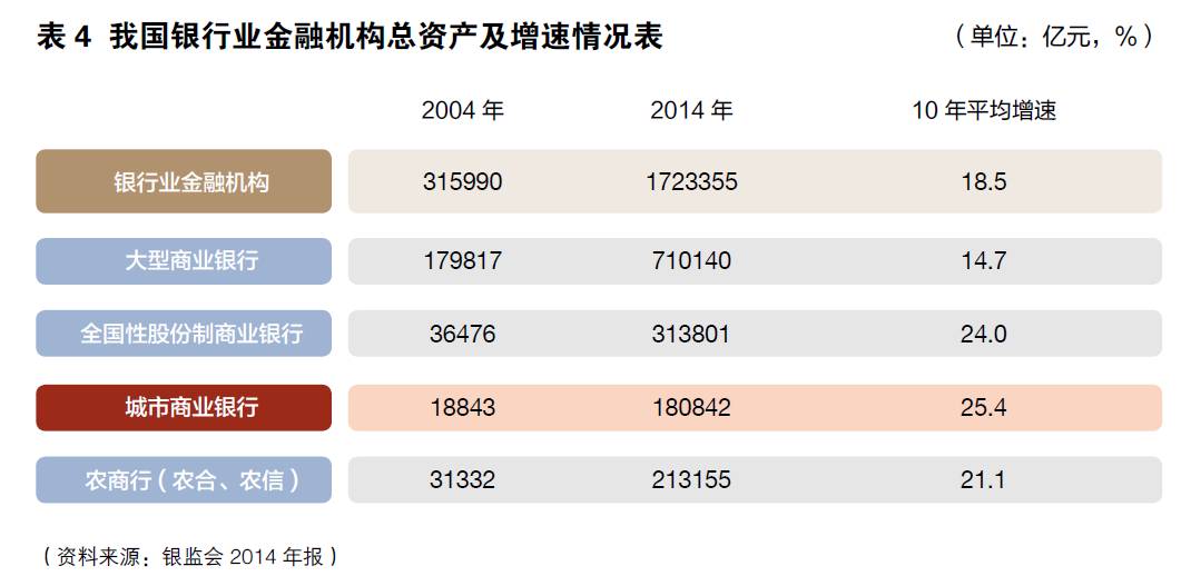 城商行资产增速较快,表明城商行较好地适应了市场化发展环境。在市场化环境下,银行业发展速度越快,越表明其能够适应市场竞争的环境,本身市场化程度越高。银行业总资产增长速度是其市场化水平的集中体现和最终结果。根据银监会年报数据,城商行近10年资产平均增速最高,为25.4%(见表4)。