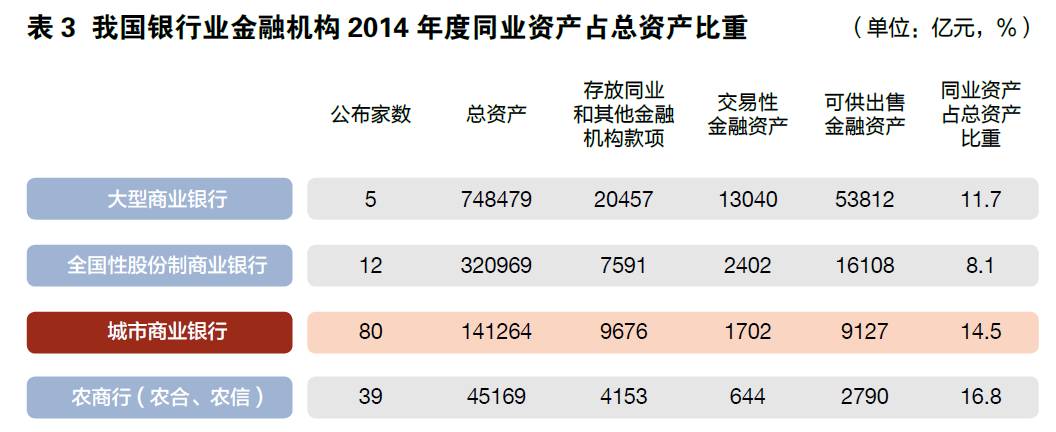 城商行同业资产比重较高,表明城商行业务总体市场化程度较高。我国银行间利率早已市场化,银行业同业业务基本是完全市场化的业务,银行业同业业务比重是其市场化水平的重要标志。从2014年136家银行同业资产占总资产比重看,农商行、城商行同业资产占总资产比重较高,分别为16.8%、14.5%。而5家大型商业银行、12家股份制商业银行同业资产比重较低,分别为11.7%、8.1%(见表3)。
