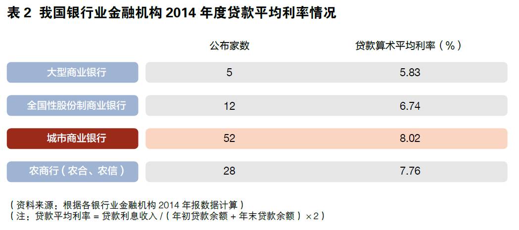 城商行保持着较高的贷款利率,表明城商行贷款业务市场化程度较高。2013年7月20日我国全面放开了商业银行贷款利率管制,由银行根据商业原则自主确定贷款利率水平。一般地,贷款利率越高,越表明贷款客户是市场化程度越高的中小企业、民营企业,贷款业务市场化水平越高。从国内各银行业金融机构年报反映的贷款平均利率看(参见表2),52家城商行平均利率最高,为8.02%;其次是28家农商行(农合行、农信社),为7.76%;再次是12家全国性股份制商业银行,为6.74%;最低是5家大型商业银行,为5.83%。