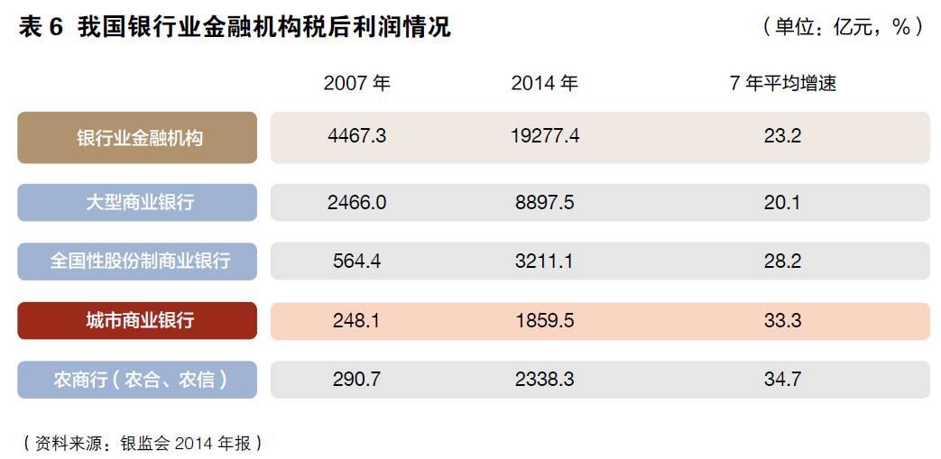 城商行税后利润增速较高,表明城商行较好适应了市场化的考验。从银行业税后利润增速看(见表6),城商行2007-2014年平均税后利润增速为33.3%,居银行业金融机构较高水平。