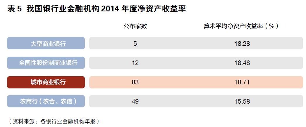 城商行盈利水平较高,表明城商行在推动市场化的同时实现了较好的市场回报。利润是银行业市场竞争的结果,是客户的“市场选票”。净资产收益率是体现银行业金融机构盈利水平的最主要指标。从已公布2014年报的149家银行业金融机构净资产收益率(算术平均)来看,83家城商行的净资产收益率最高,达18.71%(见表5)。