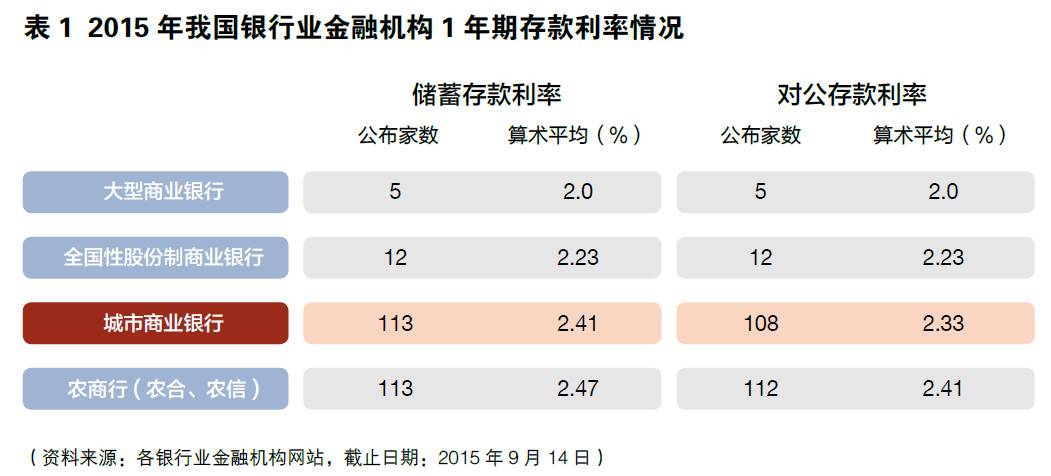 城商行存款利率水平较高,表明城商行存款业务市场化程度较高。存款是银行业的基本业务之一,存款利率的高低是存款利率市场化水平的重要标志。目前,我国城商行保持着较高的存款挂牌利率。以1年期存款利率为例,2015年9月14日各类银行业金融机构定期储蓄存款、定期对公存款挂牌利率(算术平均)为:农商行(农合行、农信社)利率最高,分别为2.47%、2.41%;其次为城商行,分别为2.41%、2.33%;再次为全国性股份制商业银行,分别为2.23%、2.23%;最低为大型商业银行,分别为2.0%、2.0%。城商行1年期定期储蓄存款利率和1年期对公存款利率仅低于农商行0.06和0.08个百分点,高居存款利率水平的第一方阵(见表1)。