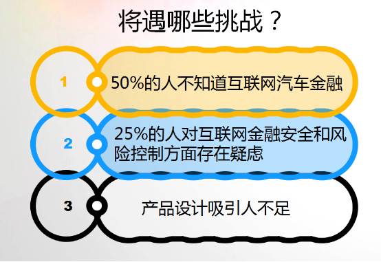 汽车金融的出现给了消费者极大的方便,一方面,汽车信贷能解决消费者支付能力不足的问题,有助于消费者以最低的机会成本运用手中的资金,另一方面,它能使消费者保持资产流动性的同时,也让他们能更灵活地支配自己的财务和选择不同的生活方式。汽车金融在国内的市场非常巨大,根据央行的统计,2014年我国汽车金融市场规模已经超过7000亿元,且从2012年到2014年其增长率均超过30%,而现在,汽车金融仍在以每年25%的速度在增长。未来三年,汽车金融市场规模将会上升至1.5万亿元。尽管如此,汽车金融市场仍有巨大的挖掘空间。因为相对国外成熟市场来说,我国汽车金融渗透率较低。根据福特亚太公司的统计,美国的汽车金融渗透率为80%以上,印度为70%,俄罗斯为30%,巴西为50%,而中国仅为17%。随着汽车金融在国内的发展,到目前已形成4种经营模式。一是最常见的模式,由商业银行提供的汽车消费按揭;二是由汽车厂商下设汽车金融公司,提供购车分期服务;三是租车公司介入的汽车金融服务;四是与互联网金融企业合作构建的金融服务模式。其中互联网金融凭借其互联网独有的高传播率与普惠性,在逐渐改变大家的消费观念和消费习惯的同时,也在迸发出令人惊讶的发展能量,其两者的结合,必定使得其拥有广阔的发展前景。汽车金融市场虽然巨大,但发展瓶颈的问题在当下越发显得紧张,互联网汽车金融在互联网技术的支持下,使得在传统模式一直存在的问题有了解决的办法。首先,大数据的发展解决传统商业信用制度不健全的问题。我国商业信用制度不健全的问题一直制约着汽车金融的发展。目前国家正在大力鼓励和开发大数据征信,这不仅能解决过往商业信用一直存在的问题,还能对互联网汽车金融的发展起到极大的推动作用。大数据对汽车金融能起到平衡收益与风险的作用,这对于开展互联网汽车金融业务的企业来说,能大大地提高其风控能力。其次,有利于解决传统模式审批慢的问题。传统车贷有三个弊端:审批速度慢、审核资料繁琐、首付较高。这不仅造成客户体验低下,甚至还使得部分客户不愿选择这种购车方式。互联网技术的出现,使得审核内容能通过系统进行过滤,并在线上进行审批,大大地提高了审批效率。此外,能防止在传统模式下的资料造假,筛选出优质的客户。在传统的汽车金融业务里,存在着部分销售人员为了提高销售业绩和贷款通过率,帮助客户造假的情况。而互联网汽车金融,能将申请环节提前,从而避免了造假的可能,筛选出优质的客户资源。另外,还可以运用互联网大数据进行反欺诈,最大程度降低坏账发生的可能性。除此之外,互联网金融还可以避免传统汽车金融在制度上、市场推广上的障碍。“互联网+”能够覆盖整个汽车产业链,为各个环节提供金融服务。虽然互联网汽车金融市场前景可期,但其发展道路仍面临众多挑战。第一,受众群体较小。有近一半的消费者并不了解互联网汽车金融产品。其原因除了企业的推广力度不够外,更重要的是由于其是新兴行业,公众对其认知程度还较低,因此,对于这个问题,企业在做好自身宣传工作的同时,更应静下心来等待行业的成熟。第二,约25%的消费者对互联网金融安全和风险控制方面存在疑虑。这一方面原因是公众对行业的认识程度不够深,另一方面是作为新兴行业,有部分业务流程还停留在传统的工作模式上,难以跟当前行业较好地配合,因此,企业应与时俱进,寻找更好的模式保障消费者的安全。另外,在产品设计上吸引力不足。国内互联网汽车金融市场区域广阔,各地客户的资质、对产品的期望、价格承受能力、逾期率等都不相同,不能沿用同一设计标准,这将会难以适应市场需求。所以企业应该根据客户设计金融产品,根据客户资质、征信等维度进行定价,利用首付比例、利率等手段控制风险。