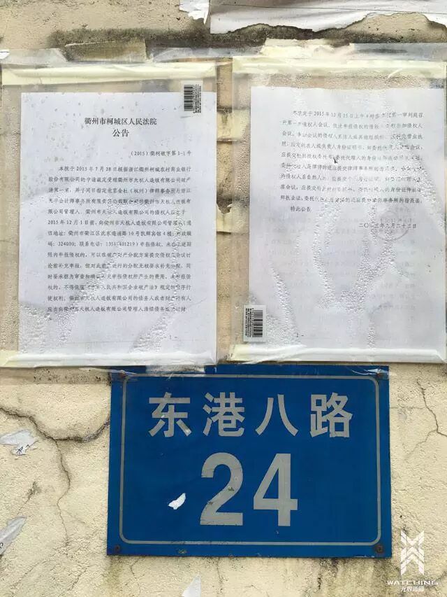 一个多月后,落款时间2015年9月22日的破产通知书——柯城区法院的(2015)衢柯破字第1—1号文书仍然送达,至今仍贴在天杭公司门口墙上。