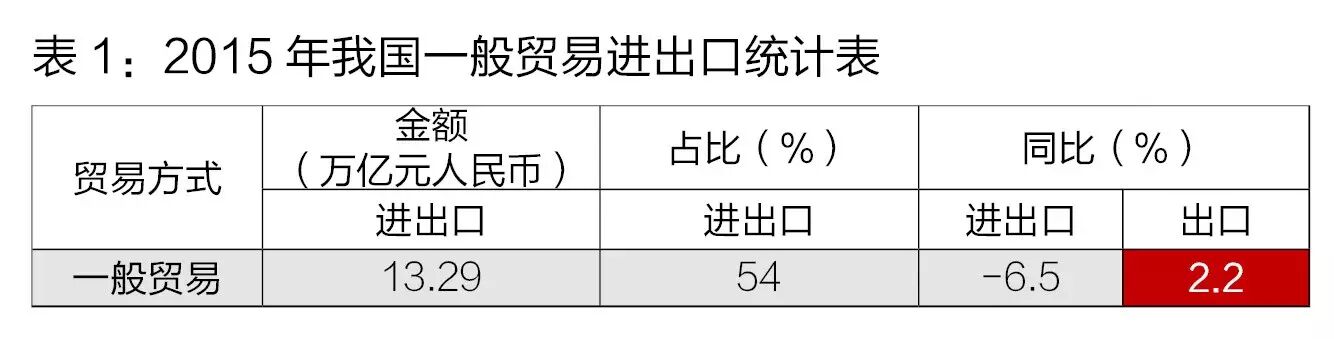 一、贸易方式更趋合理。在国务院“稳增长、调结构”相关措施的大力推进下,2015年我国一般贸易进出口值为13.29万亿元,下降6.5%,占进出口总值的54%,所占比重较上年提升0.3个百分点;其中出口增长2.2%。