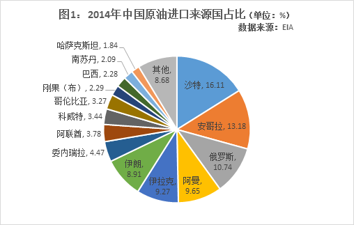 根据EIA统计(图1),2014年,中东国家占中国原油进口量的48%,几乎占据了半壁江山,前六大来源国中有4个国家来自中东地区,其中沙特更是以16%的高居榜首。而中东外的其他进口国则比较分散,安全风险偏高(如安哥拉、委内瑞拉、南苏丹等国)。不过值得注意的是,多年来一直稳坐中国原油进口第一大国宝座的沙特,今年受到了俄罗斯的强大挑战。中国海关总署2015年月度进口数据显示,俄罗斯与沙特阿拉伯轮流成为中国最大原油进口国,这也从侧面反映了沙特与俄罗斯两国在低油价下所面临的困难。