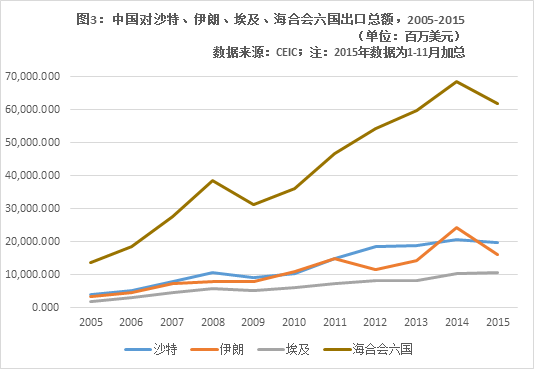 近年来,中国对中东国家的双边贸易额呈现飞速增长,其中非能源贸易的增长尤其引人瞩目。由于中东国家工业发展水平普遍不高(轻工业基础尤其薄弱),中国对中东国家的双边贸易互补性很强:中国出口以机电产品、纺织服装、高新技术产品、日用五金等为主,进口以原油和石化产品为主,非能源贸易基本集中于中国出口一端。中国对沙特、伊朗、埃及和海合会六国的出口额在近十年内不断增长(图3)。为进一步推动双边经贸合作,中国还设立了中国—阿拉伯国家博览会(中阿经贸论坛为其前身)等平台。非能源贸易的不断繁荣,直接造福于位于工业洼地中东的普通消费者。例如,越来越多的埃及人能买得起便宜的中国汽车,成为了有车一族;在被以色列封锁的加沙地带,居民日常生活依赖于廉价的中国商品。据悉,习近平主席此行的一大看点正是中国与海合会的自贸区谈判。未来,自贸区一旦落地,中阿贸易必将迎来新的发展高潮。