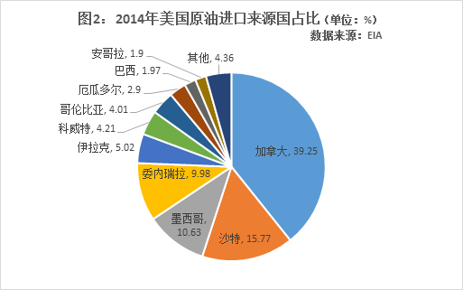 反观美国,2014年美国十大原油进口来源国分别是加拿大、沙特、墨西哥、委内瑞拉、伊拉克、科威特、哥伦比亚、厄瓜多尔、巴西、安哥拉,其中加拿大以接近40%的占比高居榜首,前四大进口国占了总量的75%。(图2)。对比中国,可以看出美国的进口源国家相对安全稳定,且大多处于美国所在的西半球。曾经位居前列的尼日利亚,早已成为十名开外。EIA分析指出,尼日利亚占比下降主要是因为美国国内产量不断增长的轻质油与尼日利亚原油品质接近,加上美国东海岸炼油厂对轻质原油需求收缩。此外,尼日利亚国内日益恶化的安全局势应该也加剧了这一下降。