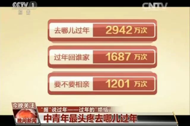 数据显示,从上个月15号到29号临近过年的这半个月里,有关过年选择的搜索超过了6000万次。热度最高的三个话题分别是“去哪儿过年(2942万次)”、“过年回谁家(1687万次)”、“要不要相亲(1201万次)”。而面临这些选择的人群主要是21岁到50岁之间的中青年。