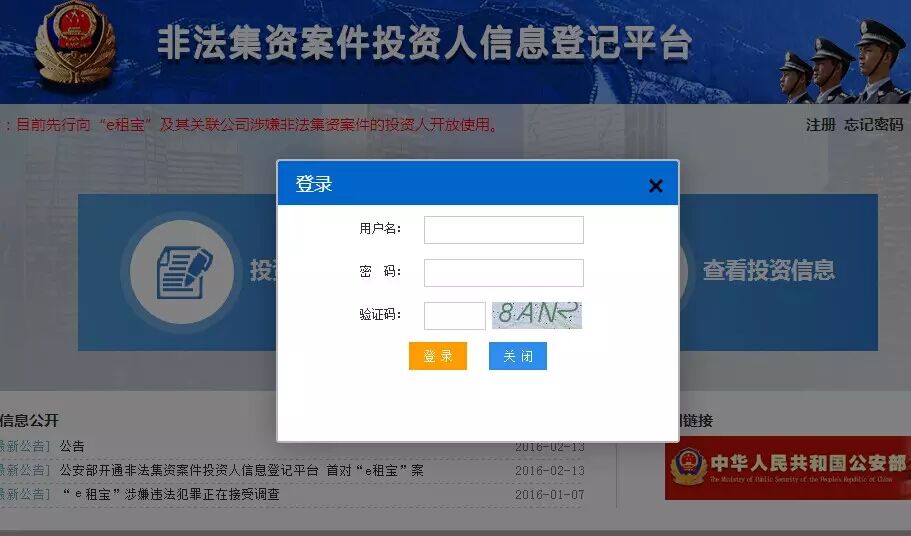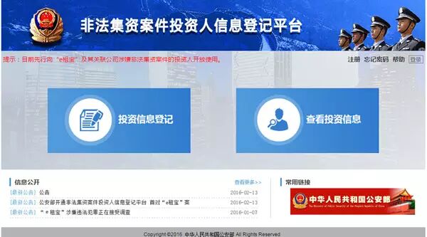 公安部开通非法集资案件投资人信息登记平台,并首先对“e租宝”案件的投资人开放!