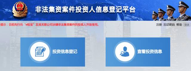 据公安部有关部门负责人介绍,近年来互联网非法集资案件频发,特别是目前公安机关正在侦办的“e租宝”及其关联公司涉嫌非法集资案件,投资人众多、涉及地域广泛、电子数据量巨大,仅用以往取证方式处理不利于海量电子数据及时汇总、统计、核实、甄别。为利用信息化手段方便投资人登记相关信息,便于投资人与公安机关沟通联系,加快各地公安机关办案进度,尽快查清案件事实和投资情况、依法统一处置涉案资产,最大限度保护投资人合法权益,公安部组织建设了非法集资案件投资人信息登记平台。该平台具备身份和投资信息登记、登记注意事项信息发布等功能,今后还将用于公安机关公告的其他重大非法集资案件。