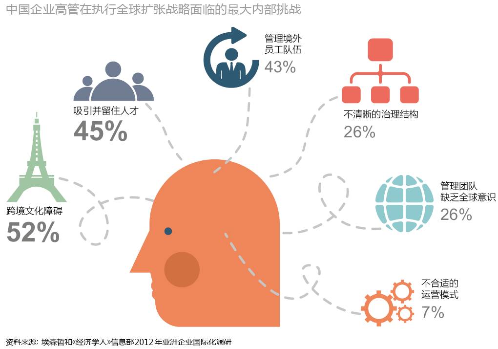 《经济学人》曾联合埃森哲对亚洲企业的国际化作过一次专项调研。结果显示,亚洲企业在执行全球扩张战略时面临的六大内部挑战中,高居榜首的三大挑战均与文化和人息息相关。尽管这次调查发生在2012年,但根据笔者自己的调研,这三大挑战不但依然是亚洲企业,同样也是欧美企业国际化的最大内部挑战。接下来的问题自然是,如何克服?