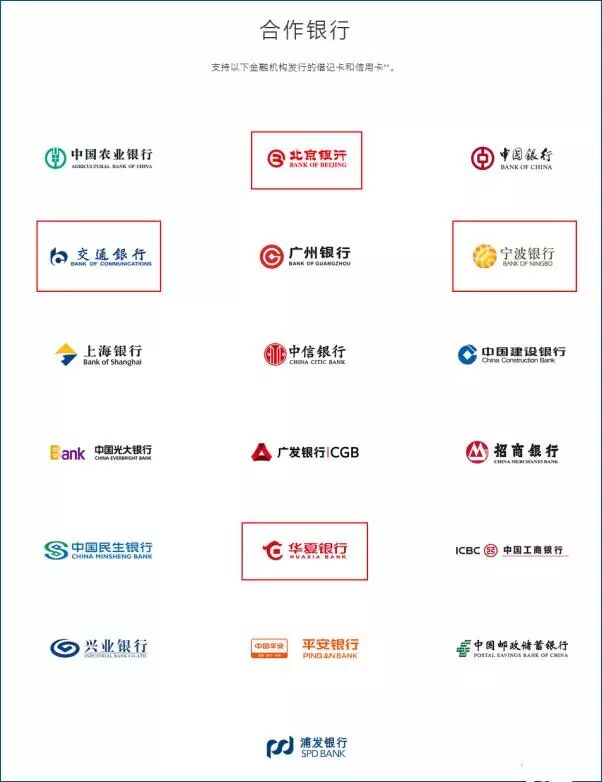 苹果移动支付服务Apple Pay与19家中国银行合作(红色框内为日前刚刚新增的4家中国银行)