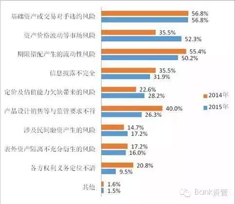 违约风险、资产价格波动风险和期限错配的流动性风险是银行资产管理业务面临的最主要风险。有56.8%的银行家认为,违约风险是银行理财业务所面临的最主要风险,该比例与去年相比基本持平。而认为资产价格波动的风险的银行家比例则显著上升,达到52.3%。在非标资产投资受到严格监管条件下,理财资金参与资本市场程度增加,对资产价格波动的敏感性显著增强。期限错配产生的流动性风险(50.2%)较去年下降5.2个百分点,银行家认为银行理财资金在期限错配问题上略有改善。同时,2015年认为产品存在销售不符合监管要求的风险(26.3%)、各方权利义务不清晰的风险(9.5%)也显著下降。前者得益于监管对银行理财销售规范的进一步加强以及银行内部对员工销售培训深入;后者随着委托贷款、信托贷款数量减少,银行理财项目投资的业务规范不断加强,各方权力义务定位不清的问题逐渐得到改善。