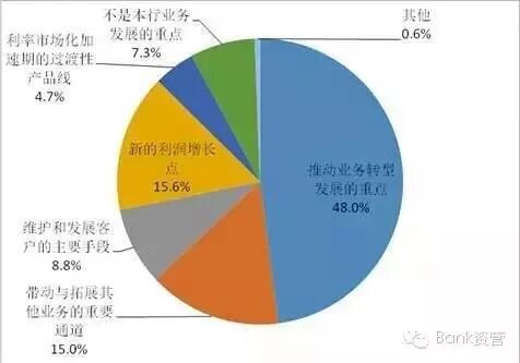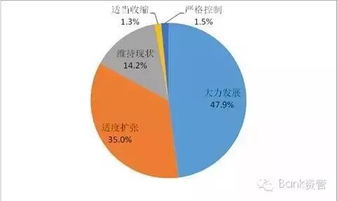 根据wind资讯统计,截止2015年1月末,中国银行业理财资金存量规模达20.00万亿元,较年初增长33.16%。在利率市场化与大资管时代的背景下,商业银行资产管理业务成为银行中间业务收入的重要来源,更是银行重点发展业务之一。在对发展资产管理业务态度的调查中,超过八成的银行家认为该业务应大力发展或适当扩张。