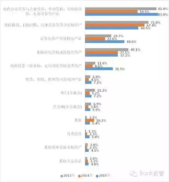 在经济下行趋势下,银行向企业投放信贷的动力开始下降,企业融资结构呈多样化发展,银行开始转变信贷资产为主的经营模式,资产管理业务可以帮助银行应对外部压力,促进经营转型。其中近一半的银行(48.0%)认为资管业务是推动银行业务转型发展的重点,而认为资产管理是拓展其他业务的重要通道和新的利润增长点的银行家比例为15.0%和15.6%。由此可见,银行资产管理业务在战略战术层面均有重要的意义。 图2 2015年银行资产管理业务定位 从理财资金投向上看,固定收益产品仍主导理财资金投向,证券化资产等结构化产品的规模持续上升。银行认为境内公司债券与企业债券、中期票据、短期融资券、私募债券产品(83.0%)与境内拆放、(逆)回购、同业拆放等货币市场资产(60.5%)是理财资金主要投资领域。近几年,两者受长短端利率波动影响,交替成为银行理财资金首要投向。另外,证券化资产等结构化产品(44.6%)取代非标准化债券或股权资产(37.2%)成为银行家认为的理财资金第三重点投资领域,非标资产在银行理财资金配置中的重要性有所下降。