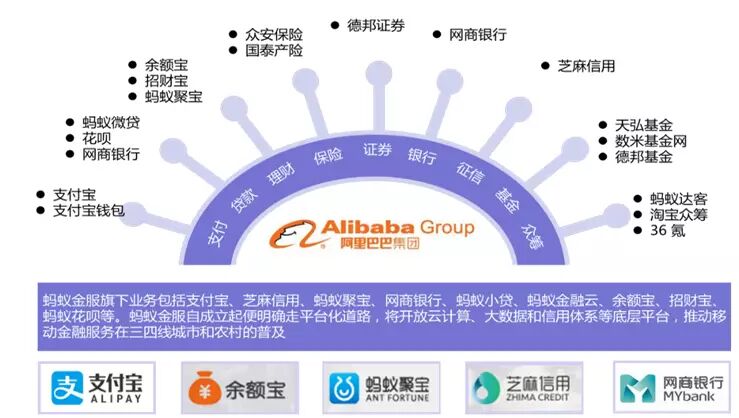 蚂蚁金融服务集团于2014年10月16日正式成立,专注于服务小微企业与普通消费者,是阿里巴巴集团多项业务中的重要一环。蚂蚁金服旗下业务包括支付宝、芝麻信用、蚂蚁聚宝、网商银行、蚂蚁小贷、蚂蚁金融云、余额宝、招财宝、蚂蚁花呗等。蚂蚁金服自成立起便明确走平台化道路,将开放云计算、大数据和信用体系等底层平台,推动移动金融服务在三四线城市和农村的普及。