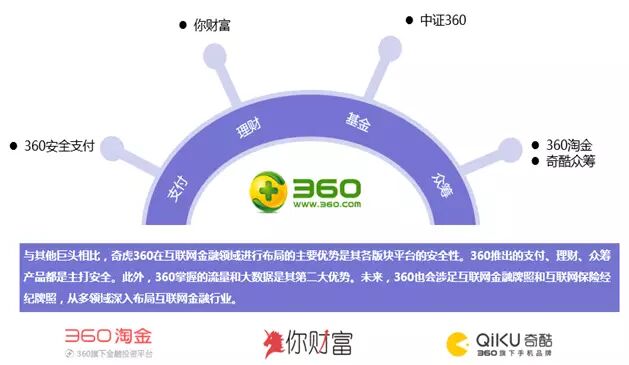 与其他巨头相比,奇虎360在互联网金融领域进行布局的主要优势是其各版块平台的安全性。360推出的支付、理财、众筹产品都是主打安全。此外,360掌握的流量和大数据是其第二大优势,而金融是一个很好的变现渠道。360目前拥有5亿PC用户和7亿手机用户,平均导航1.33亿,搜索占有33%的市场。凭借这些资源优势,360足以在互联网金融有一番作为。目前,360集团已经提交了第三方支付牌照申请,360你财富已经通过中国基金业协会的私募基金备案,并正在申请基金销售牌照。此外,奇虎360对消费金融牌照和互联网保险经纪牌照等领域也会进行布局。