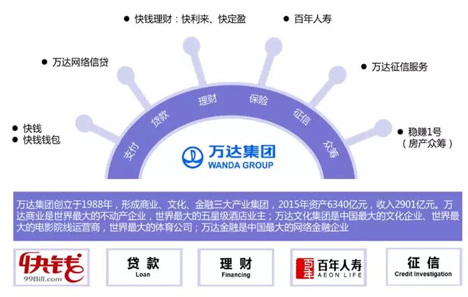 万达网络金融拥有全国最多、最齐全的商家和个人消费记录,利用先进的大数据挖掘和分析技术对海量经营消费数据科学分析和运用,形成精准的公司及个人信用评估,打造巨大价值的万达特色征信服务体系。万达并购快钱公司,整合万达自身的商业合作伙伴、每年几十亿人次线下客流和快钱公司现有的零售、保险、商旅、电商、金融机构等,近期有媒体透露,快钱已经向央行提交了个人征信牌照的申请。