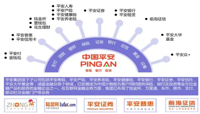平安集团旗下子公司包括平安寿险、平安产险、平安养老险、平安健康险、平安银行、平安证券、平安信托,平安大华基金等,涵盖金融业各个领域,已发展成为中国少数能为客户同时提供保险、银行及投资等全方位金融产品和服务的金融企业之一。此外,在互联网金融业务方面,集团已布局了陆金所、万里通、车市、房市、支付、移动社交金融门户等业务,互联网金融业务高速增长,截至2015年6月底,总用户规模达1.67亿。