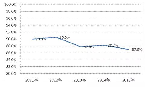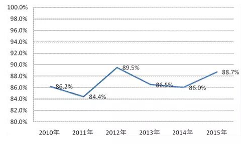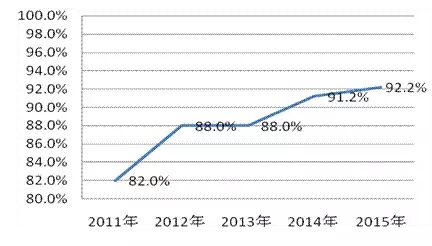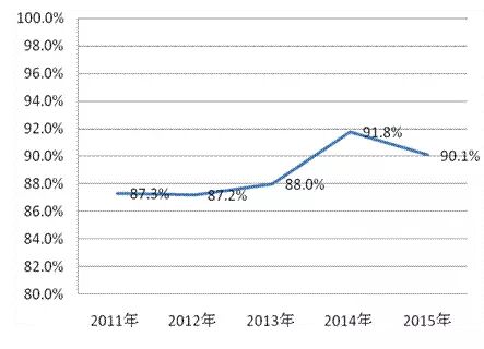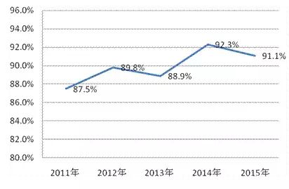 (二)全年共抽查24505家企业生产的25345批次产品,国家产品质量监督抽查合格率为91.1%。从近5年的抽查情况看,产品抽查合格率分别为87.5%、89.8%、88.9%、92.3%和91.1%,整体呈现波动上升态势,虽然2015年比2014年下降了1.2个百分点,但国家监督抽查合格率继去年之后再次达到90%以上。其中,2015年加强了食品相关产品的监督抽查力度,全年共抽查3891家企业生产的4338批次产品,抽查合格率为96.8%。