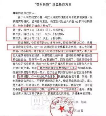 去年8月份,有投资者贴出宿州易贷的清盘最终方案,方案显示,委托社会人员打折回购投资者待收,其中待收1万以下3折回购,待收1万-5万2折回购,待收5万以上1折回购。如此明目张胆的抢钱方式——经过债权转让,平台用最多50万就能回收高达200多万元待收,实在令人发指。