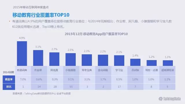 有道词典以4.9%的用户覆盖率位居移动教育行业首位;与2014年同期相比,作业帮、阿凡题、小猿搜题和学习宝几款K12类应用增长迅速,TOP10榜上有名
