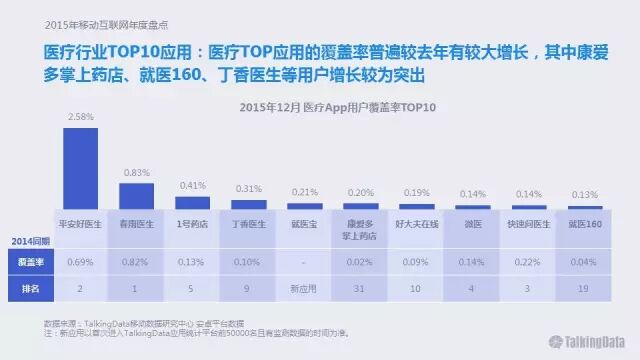 医疗TOP应用的覆盖率普遍较去年有较大增长,其中康爱多掌上药店、就医160、丁香医生等用户增长较为突出