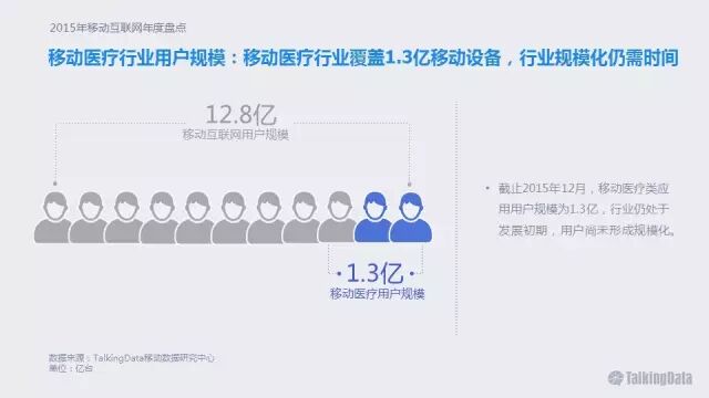 截止2015年12月,移动医疗类应用用户规模为1.3亿,行业仍处于发展初期,用户尚未形成规模化