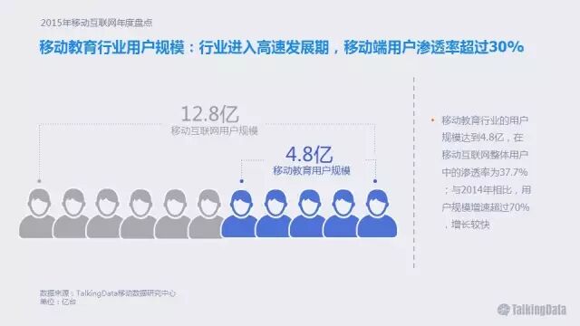 移动教育行业的用户规模达到4.8亿,在移动互联网整体用户中的渗透率为37.7%;与2014年相比,用户规模增速超过70%,增长较快