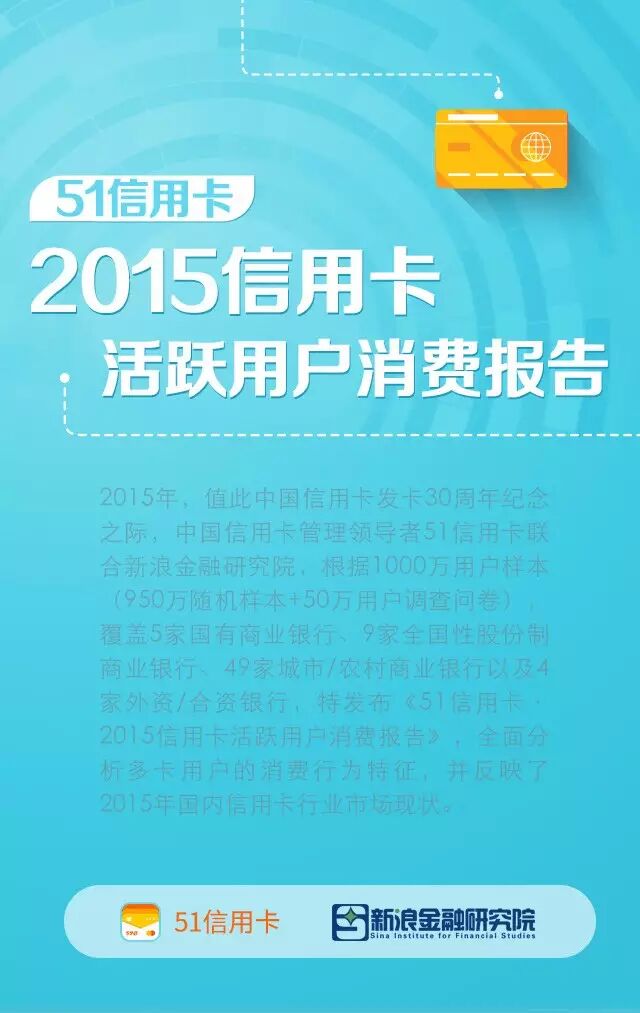 2015年,中国信用卡发行已到30周年,51信用卡与新浪金融研究院联合发布《2015信用卡活跃用户消费报告》,报告根据1000万用户样本(950万随机样本+50万用