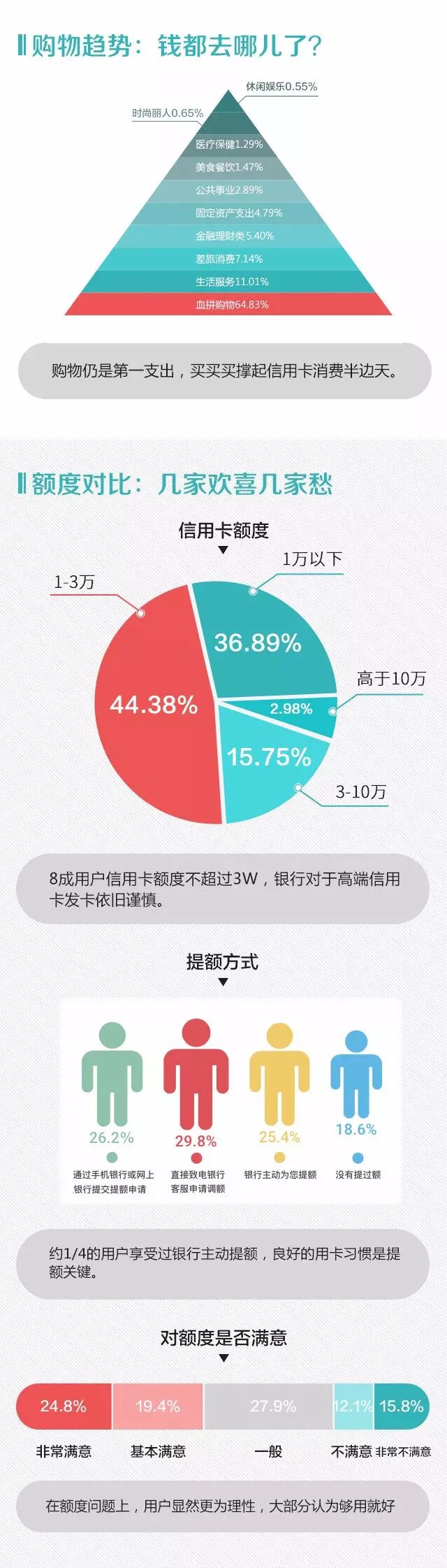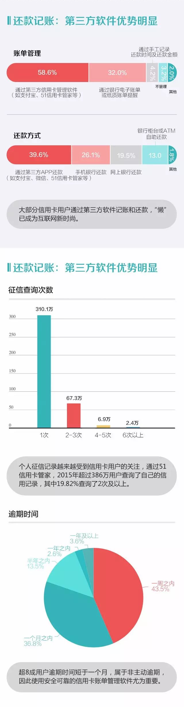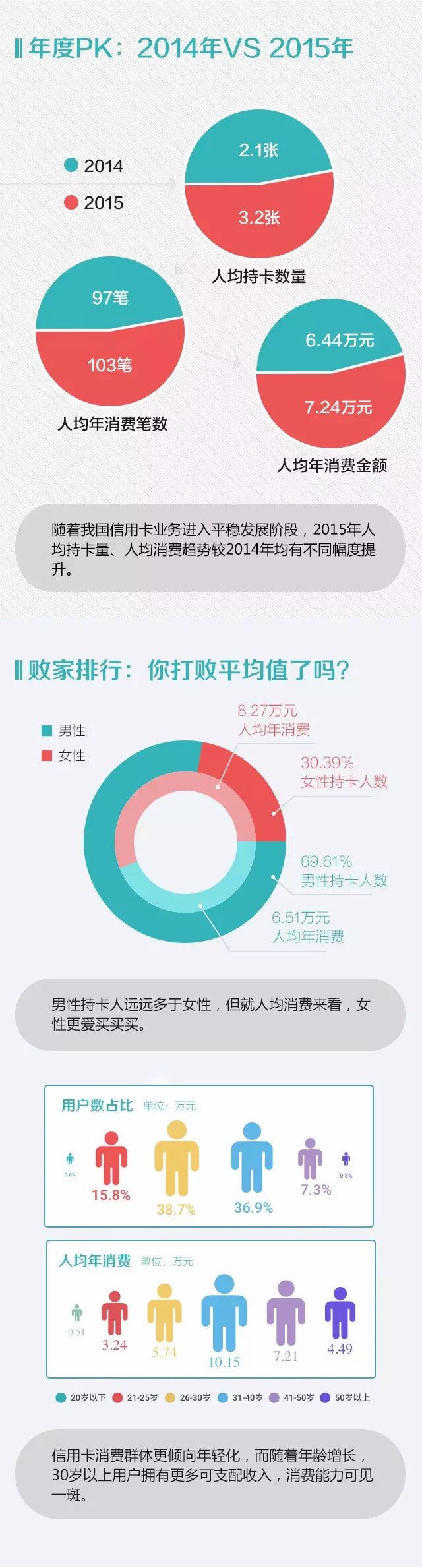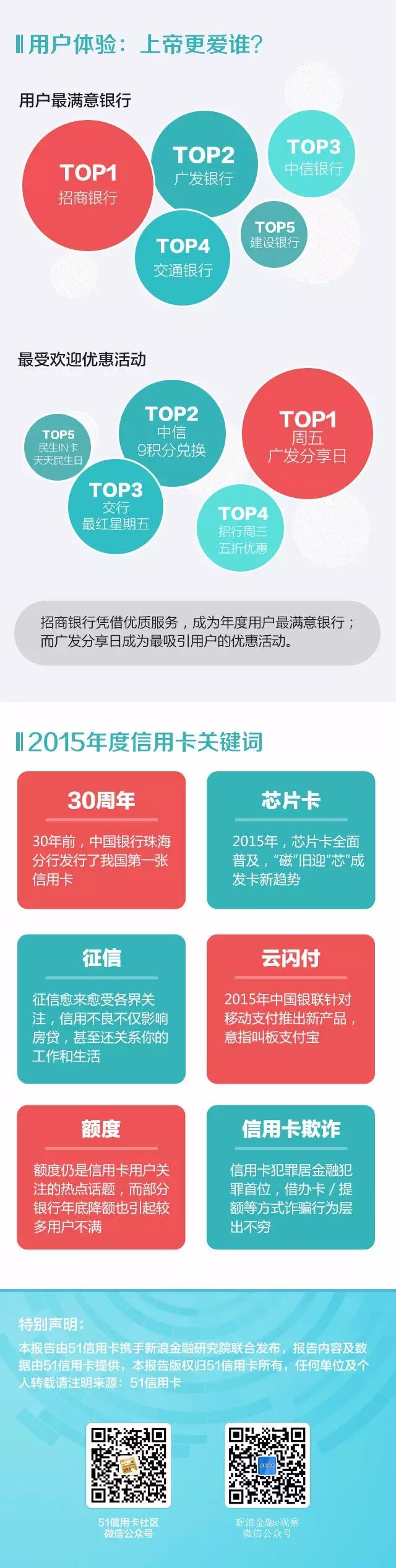 2015年,中国信用卡发行已到30周年,51信用卡与新浪金融研究院联合发布《2015信用卡活跃用户消费报告》,报告根据1000万用户样本(950万随机样本+50万用户调查问卷),覆盖5家国有商业银行,9家全国性股份商业银行,49家城市/农村商业银行以及4家外资/合资银行,全面分析多卡用户的行为特征,反映了2015年国内信用卡行业市场状况。