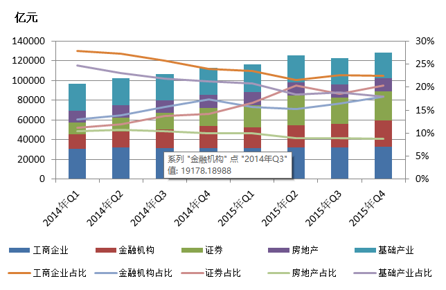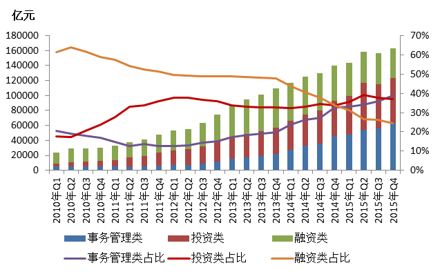 图5:2010年Q1——2015年Q4信托资产按功能分类的规模及其占比