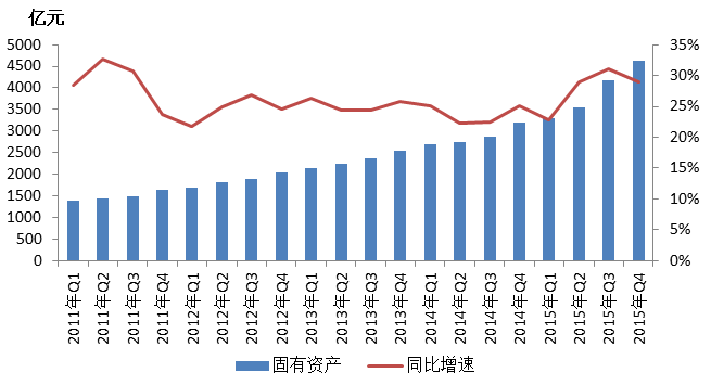 图2:2011年Q1 ——2015年Q4各季度固有资产及其同比增速