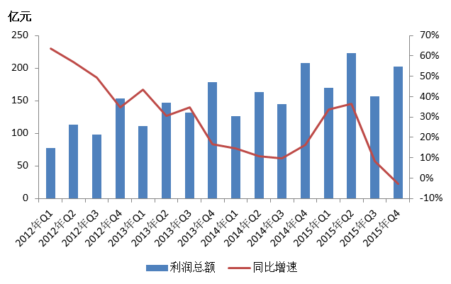 图4:2012年Q1——2015年Q4各季度利润总额及其同比增速