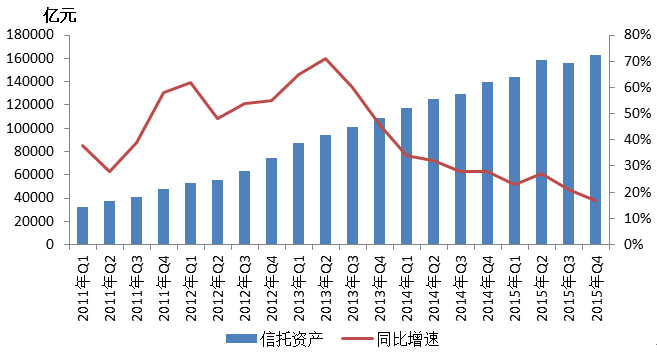 图1: 2011年Q1——2015年Q4各季度信托资产及其同比增速