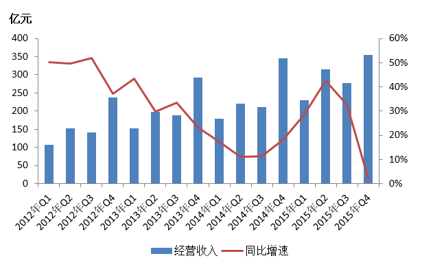 图3: 2012年Q1——2015年Q4各季度经营收入及其同比增速