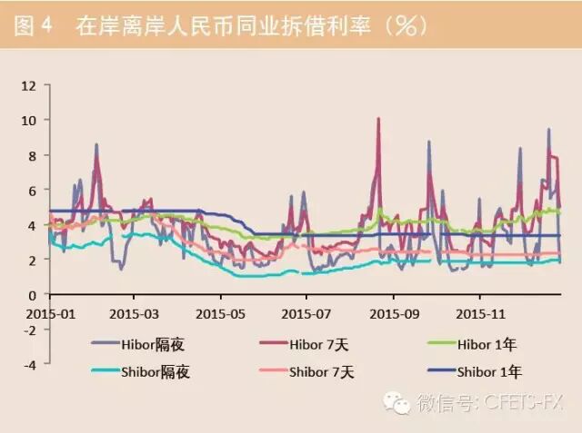 货币市场:2015年离岸人民币资金流动性出现过几次收紧,离岸市场获取人民币成本也因此多次骤升。尤其是同业拆借市场,隔夜拆借利率曾于年初及汇改之后多次飙升至8%以上。CNH Hibor隔夜、7天和1年期在年底回落分别收于1.76%、5.03%和4.63%,较上年末分别下降7个、上升161个和上升74个基点。由于相较之下在岸人民币流动性较为充裕,因此在岸拆借利率波幅也相对较小。两岸拆借利差(Hibor-Shibor)随着CNH Hibor的飙升而拉开。相较同业拆借市场,由CNH掉期计算出的CNH隐含收益率虽有波动但幅度较小,仅仅在年初、汇改以及人民币加入SDR货币篮子后产生人民币贬值预期时有所上升。这表明离岸参与人民币交易主体总体获得人民币成本并未像银行同业间那样骤升骤降。年末CNH隐含利率7天、3个月和1年期分别收于0.54%、1.87%和3.01%,较年初分别上升34、66和119个基点。