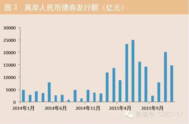 2015年,中国央行首次在海外发行了以人民币计价的央行票据;三菱东京日联银行在日本首次发行人民币债券(又称“富士山债”)。蒙古政府首次发行人民币债券,成为继英国后第二个主权政府债券。2015年共发行353只离岸人民币债券,较上年减少178只。但总发行额达到1609.59亿元,较上年增加2.6倍。