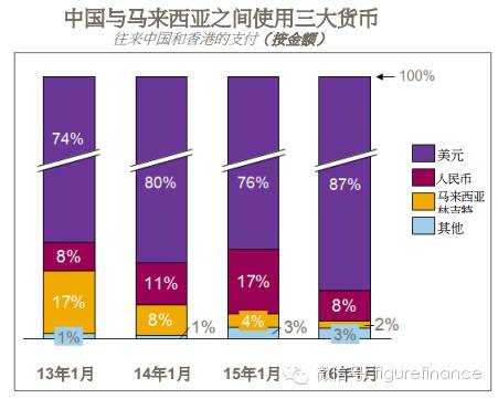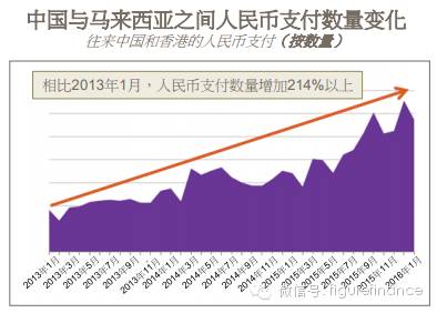 近期的SWIFT数据显示,过去12个月马来西亚与中国内地和香港的人民币支付结算数量增加68%,而过去3年来增加了214%。 2013年1月以来,人民币的支付额从第三位上升至第二位,超越马来西亚林吉特。