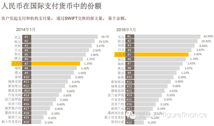 2016年1月,按金额计算,人民币依然是全球第五大活跃支付货币,占全球支付总额的2.45%,略高于2015年12月的2.31%。虽然人民币支付金额下降5.7%,但所占的业务份额高于上个月,而从全球水平看,同期所有货币的支付金额下降了11.2%。