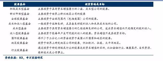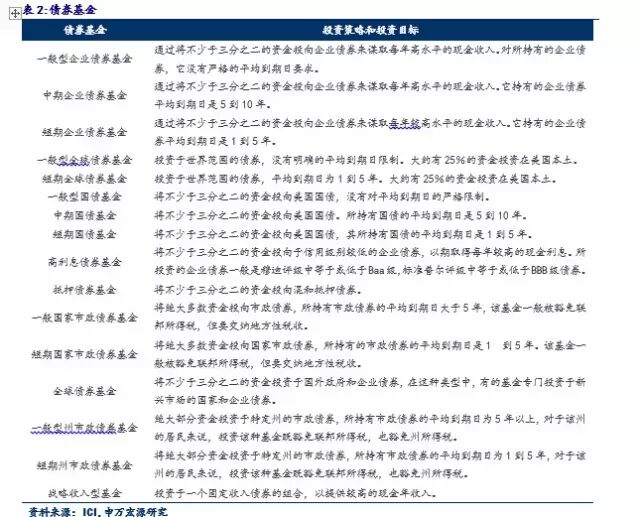在第二层级的资产配置方面,传统资产管理产品主要包括股票基金、债券基金、货币市场基金和混合基金,我们将美国投资公司协会(ICI)对这些产品的介绍整理如下,中国的具体情况我们将在后面几篇专题报告中做深入研究,敬请关注!
